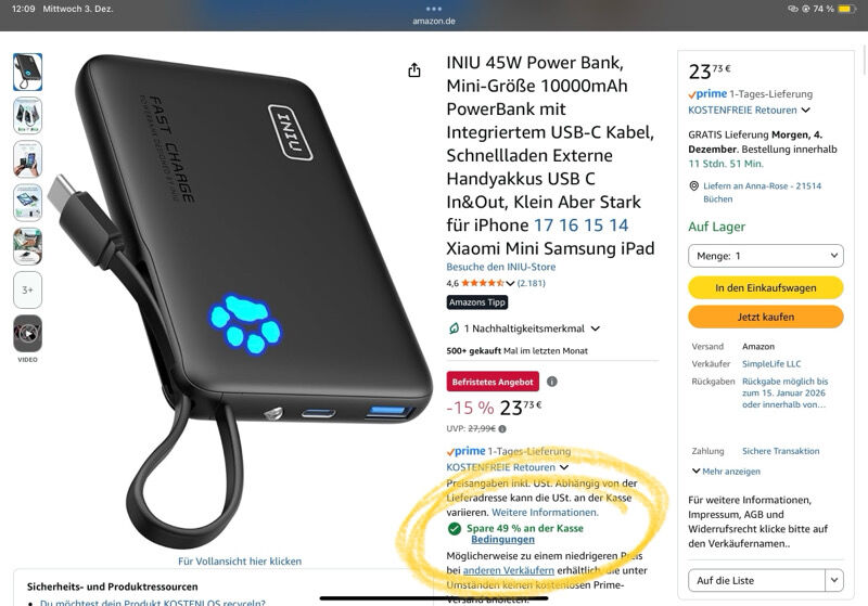 INIU kommt ja aktuell häufiger mit einem richtig starken Banger um die Ecke – und das ist auch heute nicht anders! Gerade gibt es die INIU Power Bank in Minigröße mit 20W und 10.000mAh und integriertem USB-C-Kabel extrem günstig mit 49%-Spare-an-der-Kasse. So erhaltet ihr sie für gerade mal 12,10€! Mega starker Preis! 🤩😀 Der Preis reduziert sich an der Kasse automatisch!