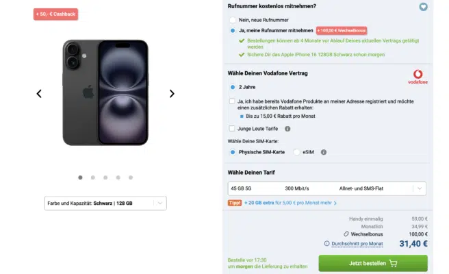 iPhone 16 (128GB) für 79€ + 45GB LTE/5G Allnet für 34,99€/MonatWert des Handys: 693€100€ Wechselbonus30€ Cashback0€ Anschlusspreis (statt 39,99€)MeinVodafone-App installierennach Erhalt der neuen SIM-Karte App öffnen und innerhalb von 7 Tagen auf der Startseite auf „Hol Dir Deinen Anschlusspreis zurück“ klickenVodafone erstattet euch die Anschlussgebühr automatisch auf eurer nächsten oder übernächsten Mobilfunkrechnung