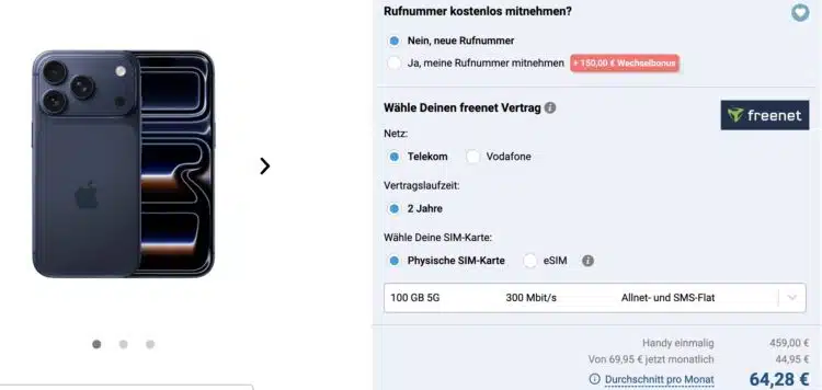 Ein schicker Deal fĂŒr das neue iPhone 17 Pro: Ihr bekommt das Smartphone mit 256GB Speicher fĂŒr einmalig 459âŹ. Dazu gibt es ein 100GB 5G/LTE Allnet-Flat im Netz der Telekom fĂŒr 44,95⏠monatlich. Das Beste: Ihr erhaltet 150⏠Wechselbonus, wenn ihr eure Rufnummer mitnehmt!Â