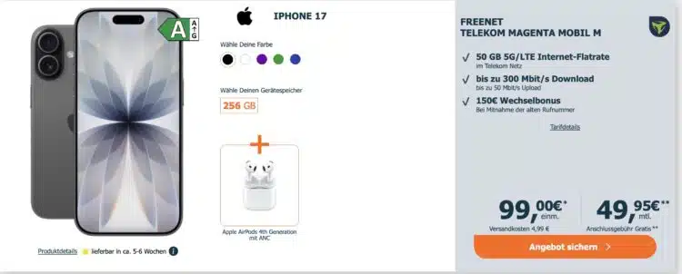 Apple iPhone 17 (256GB) für 99€ + 50GB LTE/5G Allnet für 49,95€ mtl. + 150€ Wechselbonus + 0€ AG + GRATIS AirPods 4 (Telekom Magenta M)