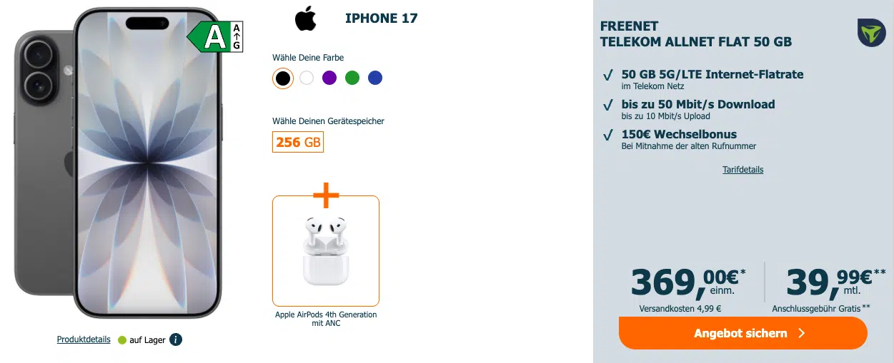 Apple iPhone 17 (256GB) für 369€ + Gratis Apple AirPods + 50GB LTE/5G Allnet für 39,99€ mtl. + 150€ Wechselbonus + 0€ AG (Freenet Telekom)