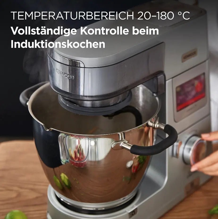 Während normale Maschinen nur rühren und kneten, hat dieses 1500-Watt-Kraftpaket ein integriertes Induktionskochfeld eingebaut. Der absolute USP: Sie heizt gradgenau bis auf 180°C hoch