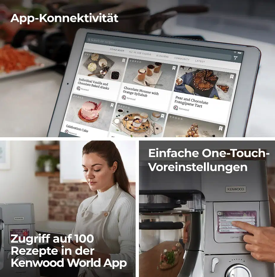 Wer Inspiration braucht, verbindet das Gerät mit der Kenwood World App und schickt die Einstellungen für das Rezept direkt vom Handy an die Maschine.