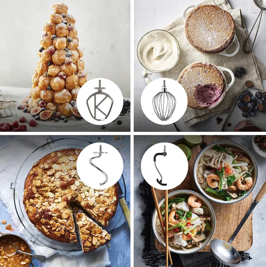 - Die Maschine verfügt über einen Hochgeschwindigkeits-Anschluss (für Mixer, Zerkleinerer) und einen Niedrigdrehzahl-Anschluss (Twist-Anschluss). Es gibt über 25 optionale Zubehörteile, von der Nudelwalze bis zum Fleischwolf (KAX-Serie).