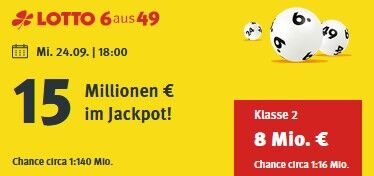 Mittwoch mit Doppel-Jackpot. Für den normalen Sechser (2. Gewinnklasse) sind 4 Mio € im Jackpot drin.