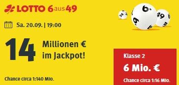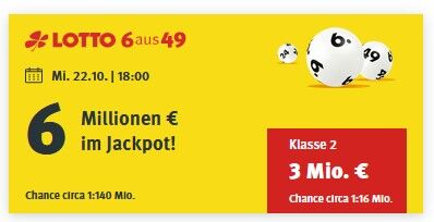 *Zum Schluss noch die obligatorische Information, dass Glücksspiel süchtig machen kann. Weitere Informationen auf http://www.bzga.de. Die Chance, den Lotto 6aus49-Jackpot zu gewinnen, liegt bei 1:140 Mio. Die Teilnahme ist erst ab 18 Jahren erlaubt.