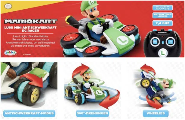 Das Highlight dieses Mini-Karts ist definitiv der Anti-Gravity-Modus. Per Knopfdruck klappen die Räder um, und ihr könnt Luigi in bester Videospiel-Manier seitwärts driften lassen oder irre Spins hinlegen. Durch die 2,4 GHz Technologie habt ihr eine stabile Verbindung auf bis zu 30 Metern Reichweite, sodass auch längere Flur-Rennen kein Problem sind.