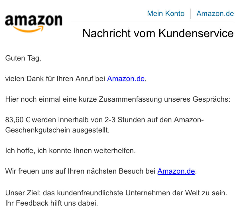 Dankeschön für den Hinweis. Bei mir ging es auch problemlos. Ich durfte mir im Chat sogar aussuchen, ob ich den Betrag auf mein Amazon – Konto als Guthaben bekommen möchte oder doch lieber als Erstattung auf das Bankkonto.
