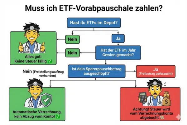 Die Grafik zeigt vereinfacht, in welchen Fällen ihr die ETF-Vorabpauschale tatsächlich zahlen müsst – und wann nicht.