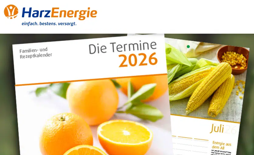 Auch von HarzEnergie gibt es wieder einen kostenlosen Kalender – und zwar den Familienkalender 2026! Der Kalender bietet euch nicht nur jede Menge Platz für all eure Termine, sondern außerdem 12 leckere Rezepte. Geliefert wird er etwa Mitte November. Bestellen könnt ihr ihn ganz einfach, indem ihr die Seite besucht und das Formular ausfüllt.