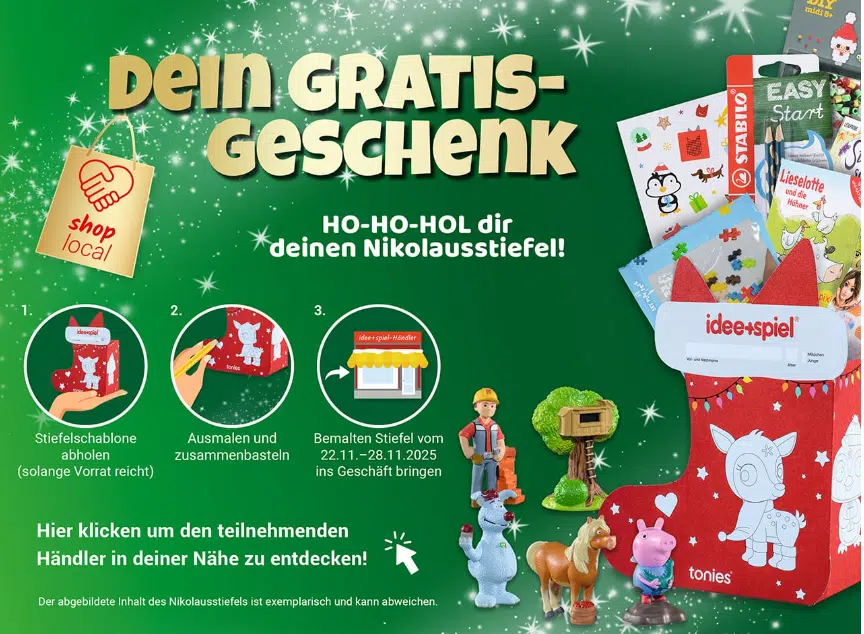 Wer zu Nikolaus nicht nur Süßigkeiten, Nüssen und Obst bekommen möchte, sollte zu idee+spiel gehen. Dort könnt ihr in teilnehmenden Filialen vom 22. – 28. November eine Bastelvorlage abholen und den Stiefel fertig gestaltet wieder zurückbringen. Der Stiefel wird dann mit Spielzeug befüllt und kann wieder abgeholt werden – den Termin dafür entnehmt ihr eurer Filiale.