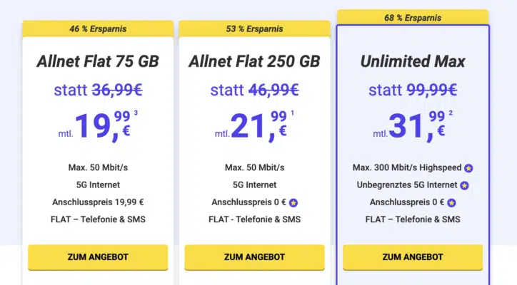 Alle Tarife (24 Monate Laufzeit)TarifLaufzeitMonatlicher GrundpreisAP24M11,99€9,99€0€Allnet Flat 300GB (50Mbit/s)24M19,99€9,99€0€24M14,99€9,99€0€24M29,99€9,99€0€Alle Tarife (mtl. kündbar)TarifLaufzeitMonatlicher GrundpreisAP1M11,99€19,99€1M19,99€19,99€1M14,99€19,99€1M29,99€19,99€Alle Tarife (24 Monate Laufzeit)TarifLaufzeitMonatlicher GrundpreisAP24M9,99€9,99€0€Allnet Flat 100GB (50Mbit/s)24M14,99€9,99€0€24M19,99€9,99€0€24M29,99€9,99€0€Alle Tarife (mtl. kündbar)TarifLaufzeitMonatlicher GrundpreisAP1M9,99€19,99€1M14,99€19,99€1M19,99€19,99€1M29,99€19,99€Alle Tarife (24 Monate Laufzeit)TarifLaufzeitMonatlicher GrundpreisAP24M9,99€9,99€0€Allnet Flat 75GB (50Mbit/s)24M12,99€9,99€0€24M16,99€9,99€0€24M29,99€9,99€0€Alle Tarife (mtl. kündbar)TarifLaufzeitMonatlicher GrundpreisAP1M9,99€19,99€Allnet Flat 75GB (50Mbit/s)1M12,99€19,99€Allnet Unlimited Basis1M16,99€19,99€1M29,99€19,99€Alle Tarife (24 Monate Laufzeit)TarifLaufzeitMonatlicher GrundpreisAP24M9,99€9,99€0€Allnet Flat 150GB (50Mbit/s)24M19,99€9,99€0€Allnet Flat 300GB (50Mbit/s)24M24,99€9,99€0€24M29,99€9,99€0€Alle Tarife (mtl. kündbar)TarifLaufzeitMonatlicher GrundpreisAP1M9,99€19,99€Allnet Flat 150GB (50Mbit/s)1M19,99€19,99€Allnet Flat 300GB (50Mbit/s)1M24,99€19,99€1M29,99€19,99€