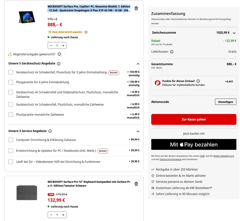 - Microsoft Surface Pro + GRATIS Keyboard für 888€