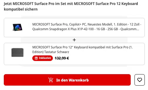 Wer auf die neueste Generation der Surface-Modelle gewartet hat, bekommt jetzt bei MediaMarkt ein richtig starkes Bundle geschnappt. Ihr erhaltet das brandneue Microsoft Surface Pro mit Snapdragon X Plus Prozessor für 888€ und bekommt die passende Tastatur direkt gratis mit dazu!
