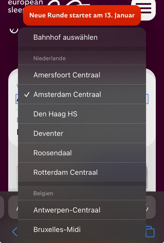 Nur ab NL oder Belgien. Vermutlich danach kein Zugstieg mehr, weil man Schlafende weckt.