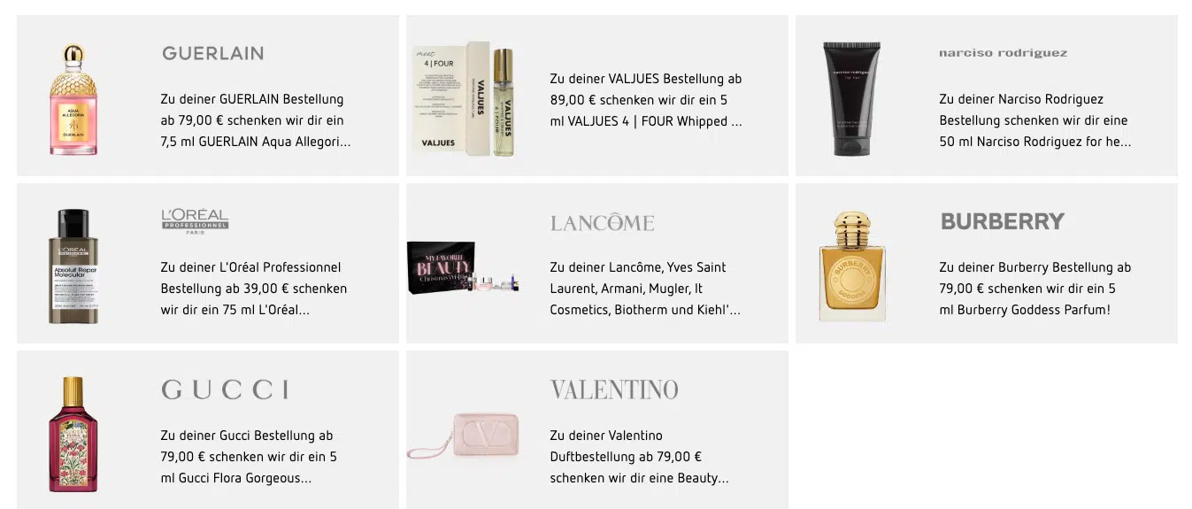 Ab einem bestimmten Bestellwert bekommt ihr kostenlose Marken-Geschenke dazu – z. B. Mini-Düfte, Beauty-Pouches oder kleine Pflegeprodukte.