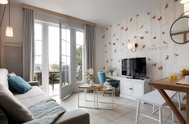 Die Pierre & Vacances Premium Residenz liegt auf einem Hügel in Houlgate und bietet euch einen fantastischen Blick auf die normannische Küste. Ihr seid hier in einem voll ausgestatteten Apartment untergebracht. Das bedeutet: Morgens gemütlich aufstehen, Baguette und Croissants beim lokalen Bäcker holen und auf dem eigenen Balkon oder der Terrasse frühstücken, ohne an feste Buffet-Zeiten gebunden zu sein.