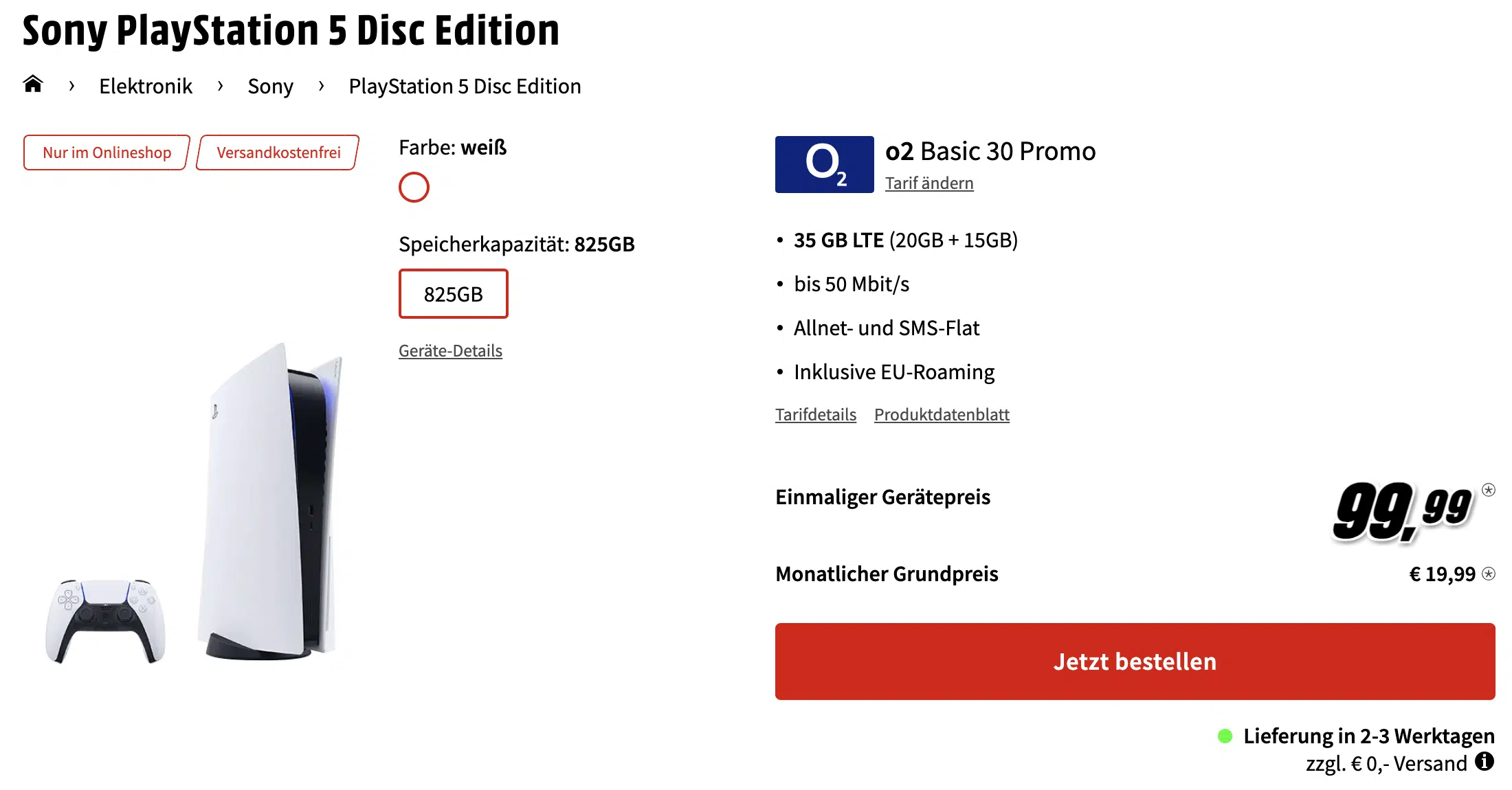 Lust auf die Playstation 5 als Disc Edition? đ Ihr bekommt bei MediaMarkt die PS5 fĂŒr einmalig lĂ€ppische 1âŹ, dazu einen Tarif mit 35GB Allnet fĂŒr 19,99⏠im Monat im o2 Netz.