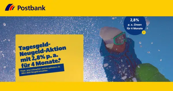 Die Postbank bietet euch hier eine klassische „Zinshopper“-Chance. Anstatt euer Geld bei 0,75% versauern zu lassen, bekommt ihr durch die Einzahlung von Neugeld (Geld, das bisher nicht bei der Postbank oder Deutschen Bank lag) satte 2,8% p.a.. Das Ganze ist besonders attraktiv für alle, die eine größere Summe (bis zu 250.000€) sicher und liquide parken wollen. Der Aktionszeitraum läuft vom 01.04. bis zum 31.07.2026 – perfekt, um das Geld für den Sommerurlaub oder anstehende Anschaffungen noch ein bisschen „arbeiten“ zu lassen, ohne ein Risiko einzugehen.