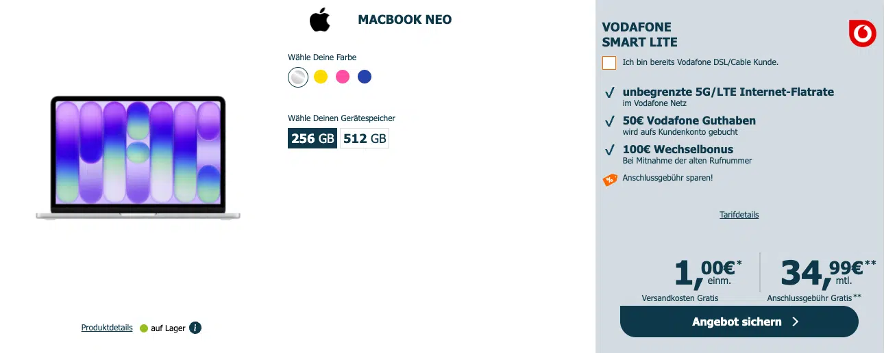 Mit Gigakombi nur 29,99€ + effektiv GRATIS 🤩 Apple MacBook Neo (256GB) für 1€ + Unlimited 5G Allnet für mtl. 34,99€ (Vodafone Smart Lite)