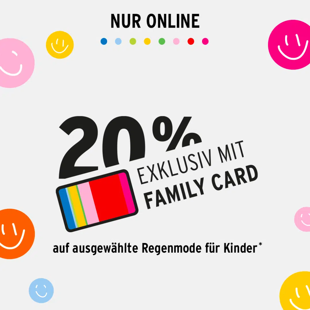 *Der Rabatt gilt vom 16.08. bis 30.10.2023 auf alle gekennzeichneten Artikel der Themenwelt „Regenmode-Aktion für Kinder“ und exklusiv mit Family Card. Gültig im Online Shop und in der App von Ernsting’s family. Online Exklusiv Artikel sind in allen Filialen von Ernsting’s family bestellbar. Der Rabatt gilt nicht für Gutscheine und Versandkosten. Internetpakete können nicht nachträglich bei Abholung in der Filiale rabattiert werden. Nicht kombinierbar mit anderen (Aktions-)Rabatten. Der Rabatt wird automatisch im Warenkorb abgezogen.