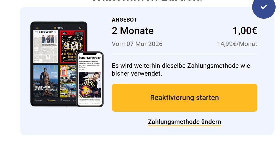 Danke, sehr schön dieser Deal. Bin dabei, Readly mag ich sehr