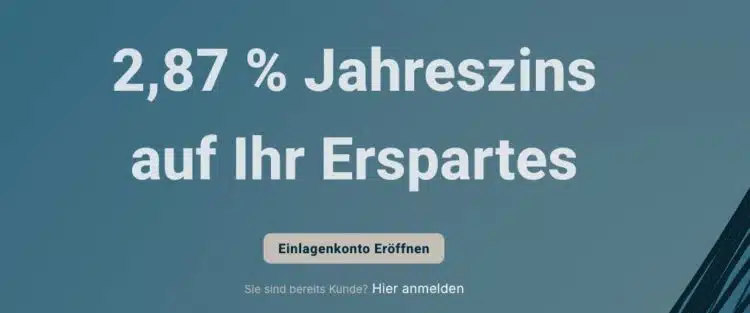 Der Zinssatz von 2,87% p.a. ist attraktiv für alle, die ihr Geld nicht auf dem unverzinsten Girokonto liegen lassen wollen. Wichtig zu wissen: Es gibt hier eine Mindesteinlage von 5.000€. Das Angebot richtet sich also an Sparer, die bereits einen gewissen Grundstock aufgebaut haben und diesen nun arbeiten lassen möchten.