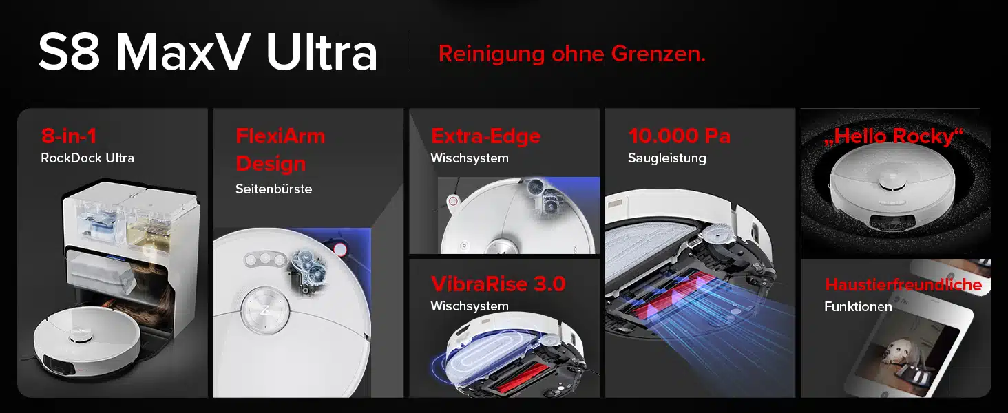Wenn euch herkömmliche Saugroboter lĂ€ngst nicht mehr reichen, kommt hier ein echtes Luxus-Upgrade fĂŒr euer Zuhause: Der roborock S8 MaxV Ultra gehört zu den aktuell leistungsstĂ€rksten Robotern am Markt â inklusive ausfahrbarer SeitenbĂŒrste fĂŒr echte 100%-Kantenabdeckung*, 10.000Pa Saugkraft, HeiĂwasser-MoppwĂ€sche und einem vollautomatischen All-in-One-Dock. Heute bekommt ihr das Premium-Modell so gĂŒnstig wie selten.
