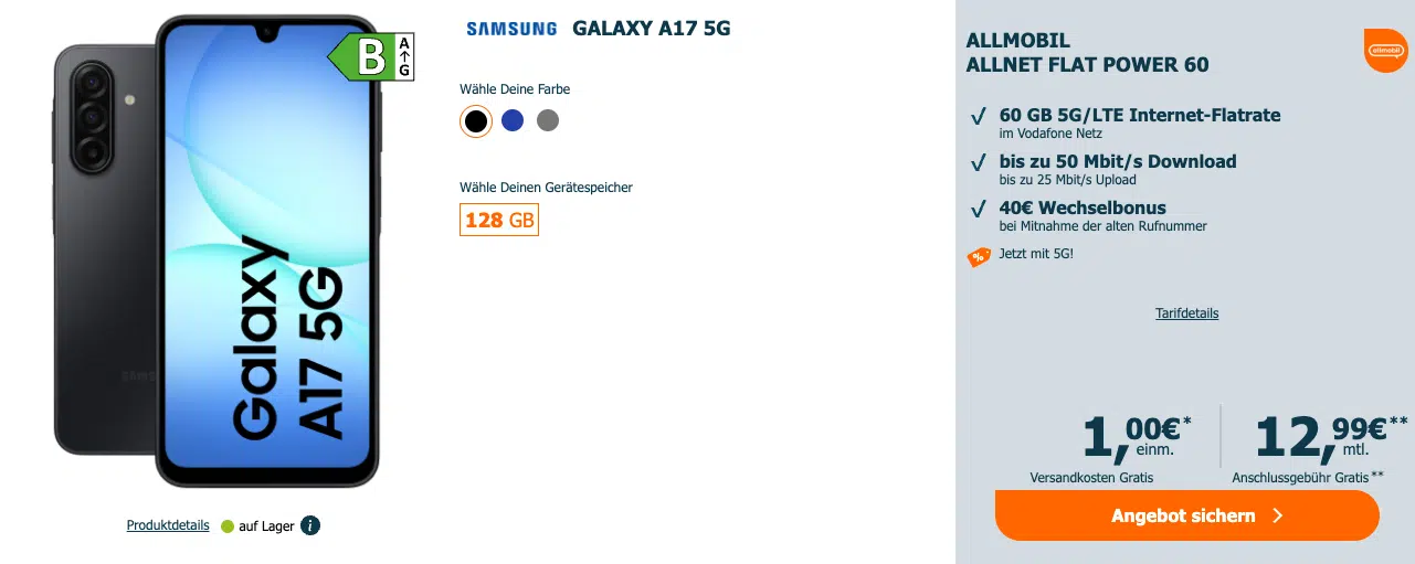 - Samsung Galaxy A17 5G (128GB) für 1€ + 60GB 5G/LTE Allnet für 12,99€/Monat