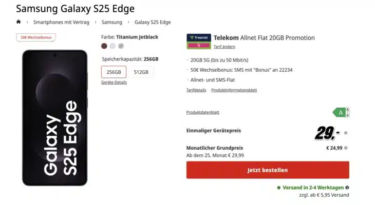 - 🔥 Samsung Galaxy S25 Edge (256GB) für 79€ + 20GB 5G/LTE Vodafone Allnet für 19,99€/Monat