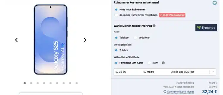 - Samsung Galaxy S25 (128GB) für 1€ + 450GB 5G/LTE Telekom Allnet für 29,99€/Monat
