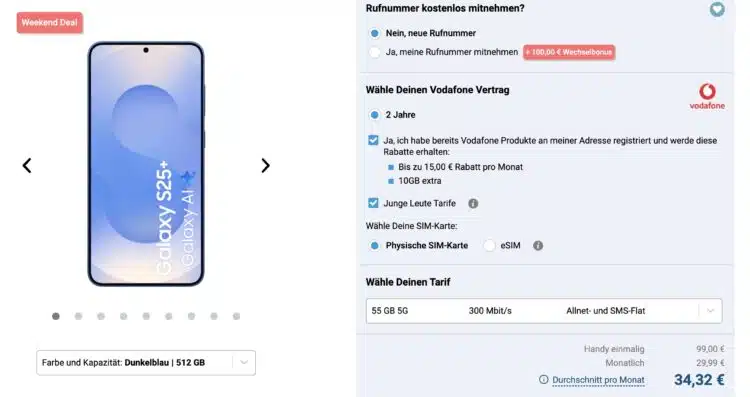 - Samsung Galaxy S25+ 5G für 99€ + 45GB 5G/LTE Allnet für 34,99€/Monat