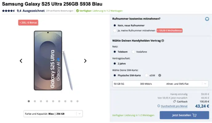 - Samsung Galaxy S25 Ultra 256GB fĂŒr 59⏠+ 50GB LTE/5G Allnet im Telekom-Netz fĂŒr 44,95âŹ/Monat