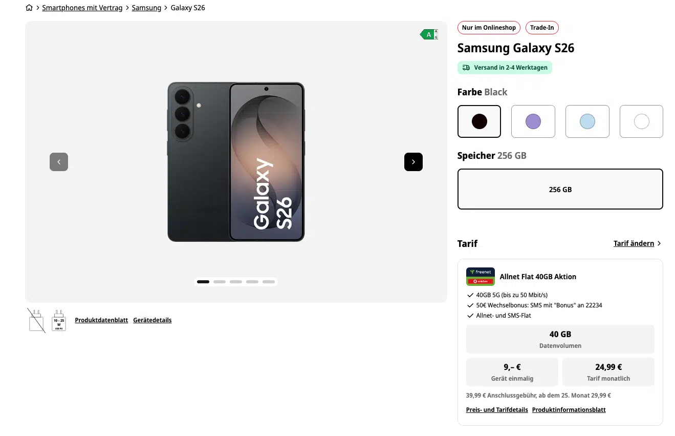 - Samsung Galaxy S26 für 9€ + 40GB 5G Vodafone für 24,99€/Monat