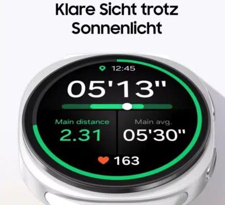 Das verbaute SuperAMOLED-Panel wird durch Saphirglas geschützt und erreicht eine beeindruckende Spitzenhelligkeit von 3.000 Nits, was die Ablesbarkeit auch bei direkter Sonneneinstrahlung garantiert.