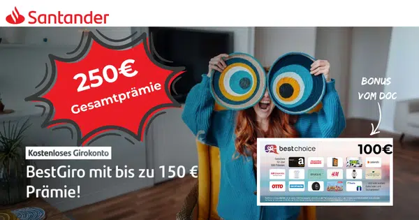 - Bis zu 250€ Gesamtbonus für das Santander BestGiro