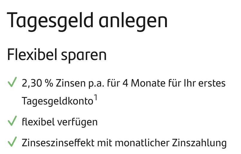 „2,30 % p.a. für die ersten 4 Monate für alle ab dem 19.02.2025 eröffneten Tagesgeldkonten“
