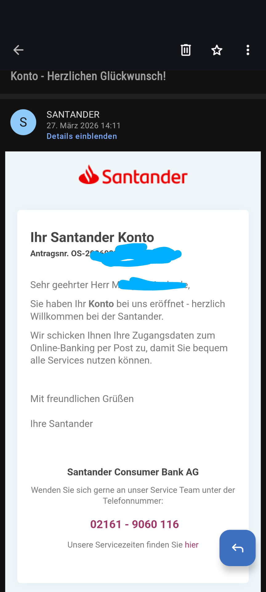 Habe zwar nicht verstanden, warum es unbedingt erneut nötig war, da ich bei der Santander bereits ein Girokonto habe. Aber was solls.