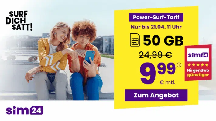 TOP mtl. kündbare 5G Allnet mit 50GB für 9,99€/Monat 💪 uvm. (SIM24 im 1&1-Netz)