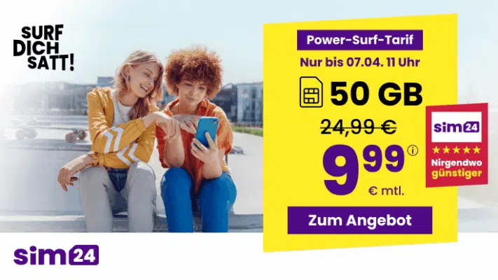 TOP mtl. kündbare 5G Allnet mit 50GB für 9,99€/Monat 💪 uvm. (SIM24 im 1&1-Netz)