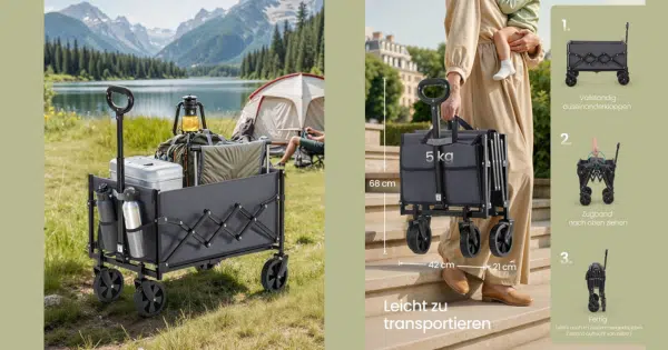 Ob fürs nächste Picknick, den Wocheneinkauf oder den spontanen Ausflug ins Grüne – so ein faltbarer Handwagen ist einfach Gold wert. Und genau hier wird’s spannend: Für gerade mal 26,99€ bekommt ihr ein Modell, das ordentlich was wegschleppt und dabei kaum Platz wegnimmt. Gerade im Vergleich zu vielen Bollerwagen, die schnell deutlich teurer werden, ist das hier ein ziemlich guter Deal.