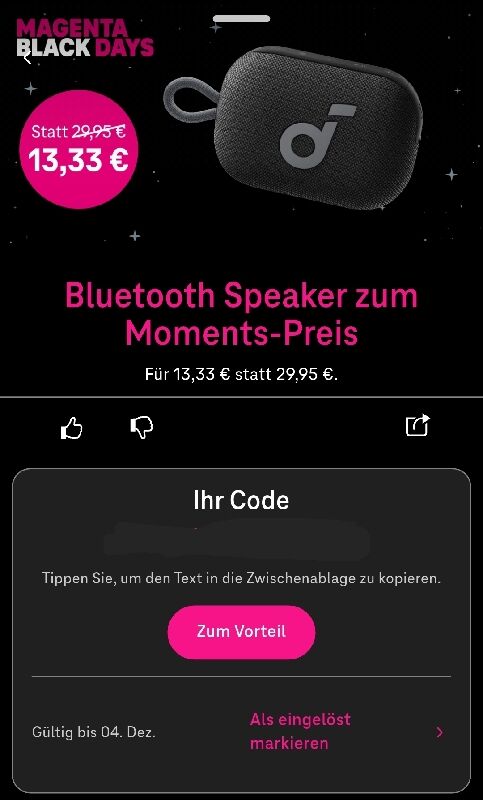 Denn ich habe durch Magenta Moments einen Rabattcode sodass ich auf 13,99 ⏠kĂ€me und mein aktueller Lautsprecher fĂŒr die Dusche ist nicht wirklich das wahre, zudem wĂ€re es toll, wenn ich den kleinen mit den soundcore glow koppeln könnte, sodass ich nicht erst zwischen der Box in der Dusche zu der/den Boxen aus der Dusche switchen mĂŒsste.