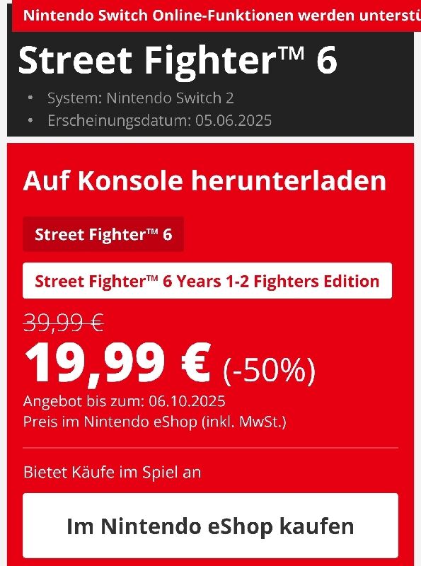 Ach ja, Street Fighter… Nostalgie kommt auf. 😁 Wenn ihr euch auch gerade nostalgisch fühlt, seht doch mal bei Amazon vorbei – dort bekommt man nämlich Street Fighter 6 Year 1-2 in der Fighters Edition für die Nintendo Switch 2 für nur 30,33€! Macht euch bereit, denn es warten spannende Kämpfe auf euch! 🥷
