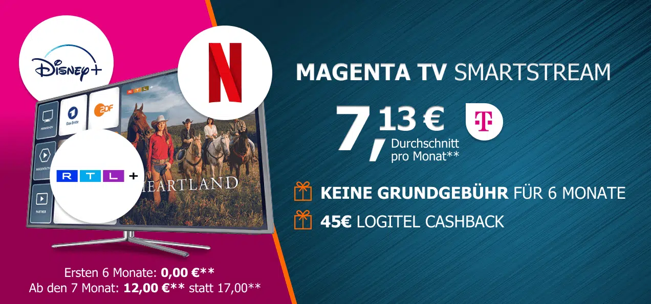 TOP 6 Monate GRATIS 🔥 Telekom MagentaTV SmartStream: 45€ Cashback für TV in HD + Netflix + Disney+ & RTL+ ➡️ ab dem 7. Monat nur 12€ (=> effektiv 7,13€/Monat)