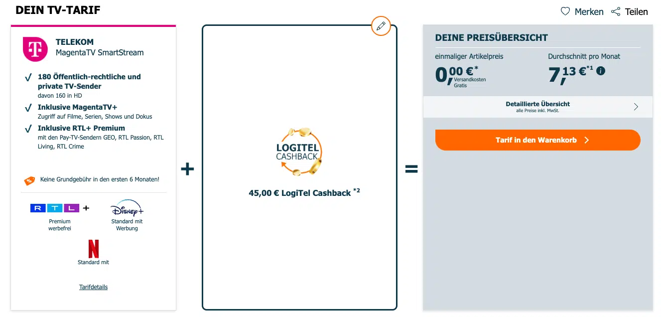 Normalerweise kostet diese Kombi deutlich mehr. Der Trick liegt hier im Cashback von LogiTel und den 6 Freimonaten der Telekom.