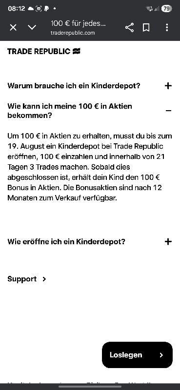 Zusätzlich zu den 20€ für deine eigene Depoteröffnung bekommst du pro eigenem Kind noch 100€ obendrauf, wenn du ein Kinderdepot eröffnest. Die Bedingungen im Detail findest du nach Abschloss des Erwachsenen-Depots auf der Trade-Republic-Landingpage. Hier das wichtigste zusammengefasst: