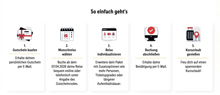 Ihr kauft hier einen Gutschein für 50€ in Höhe von 100€ – und habt also für eure nächste Reise eine Ersparnis von 50€. Den Gutschein könnt ihr ab Januar 2026 auf über 1.000 Angebote anwenden. Es stehen Städtereisen, Wellnessangebote, Musicals, Freizeitparks und noch viel mehr zur Auswahl, sodass sich wirklich für jeden die passende Reise finden lässt. Der Gutschein besitzt eine Gültigkeit von zwei Jahren. Ihr könnt euch mit dem Buchen also bis Dezember 2028 Zeitlassen.