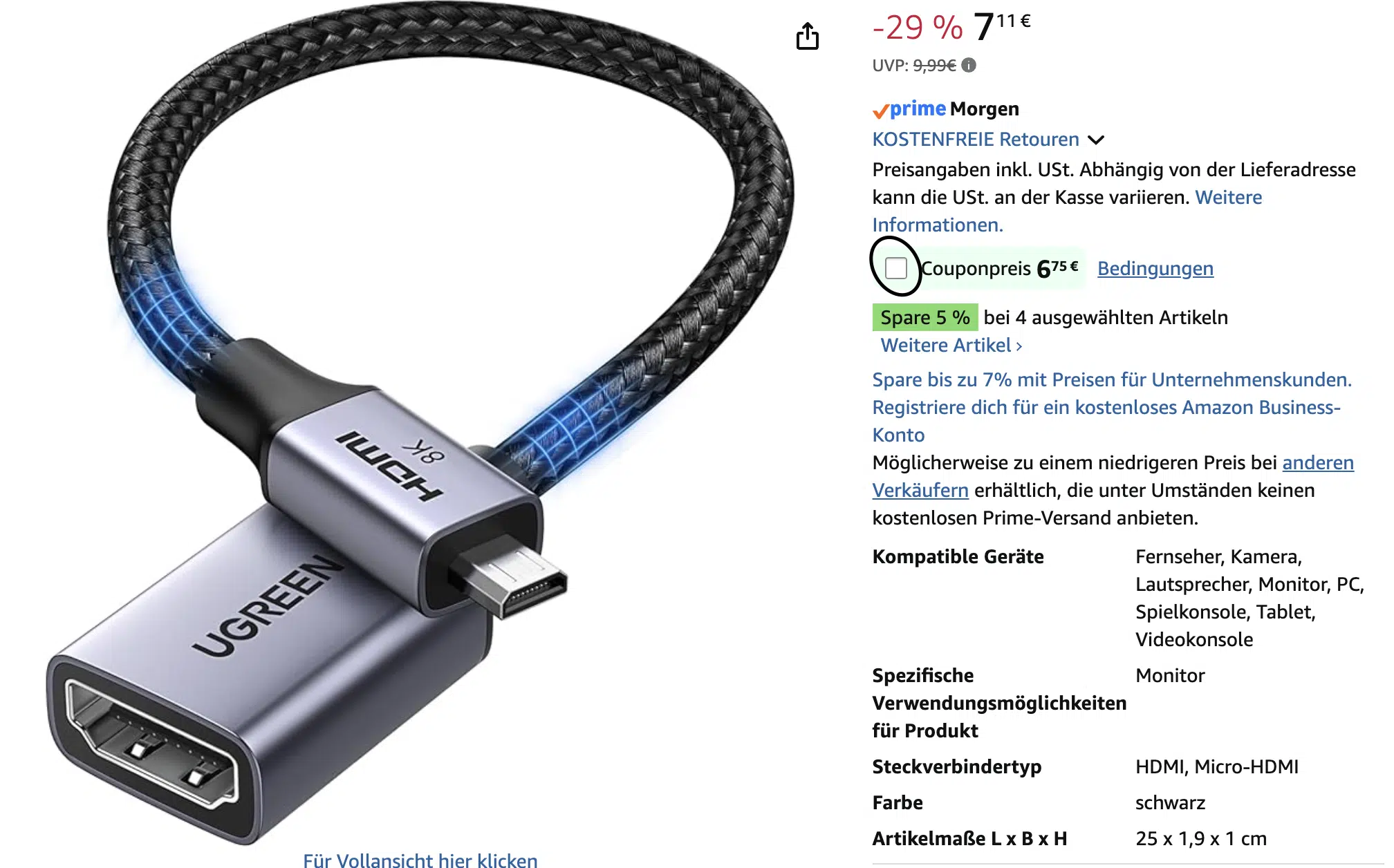 - UGREEN 8K Micro HDMI auf HDMI 2.1 Adapter (25cm) für 6,75€