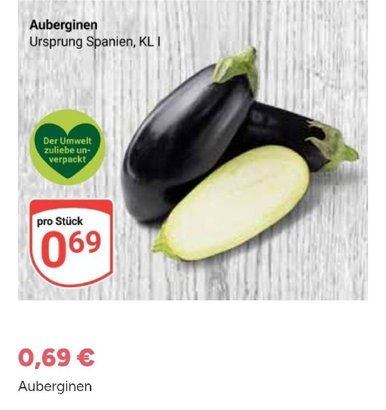 Auberginen gerade bei Aldi Nord für 0,69 € gesehen und bei Edeka für 0,99 €.