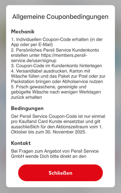 In der Kaufland App im Bereich Home – Exklusive Partnervorteile findet man bis 31.10.2025 12€ Rabatt für Persil Service, den Wäschereinigungsdienst von Persil. Man schickt die zu reinigenden Kleidungsteile ein und bekommt sie gereinigt per Paket zurück.